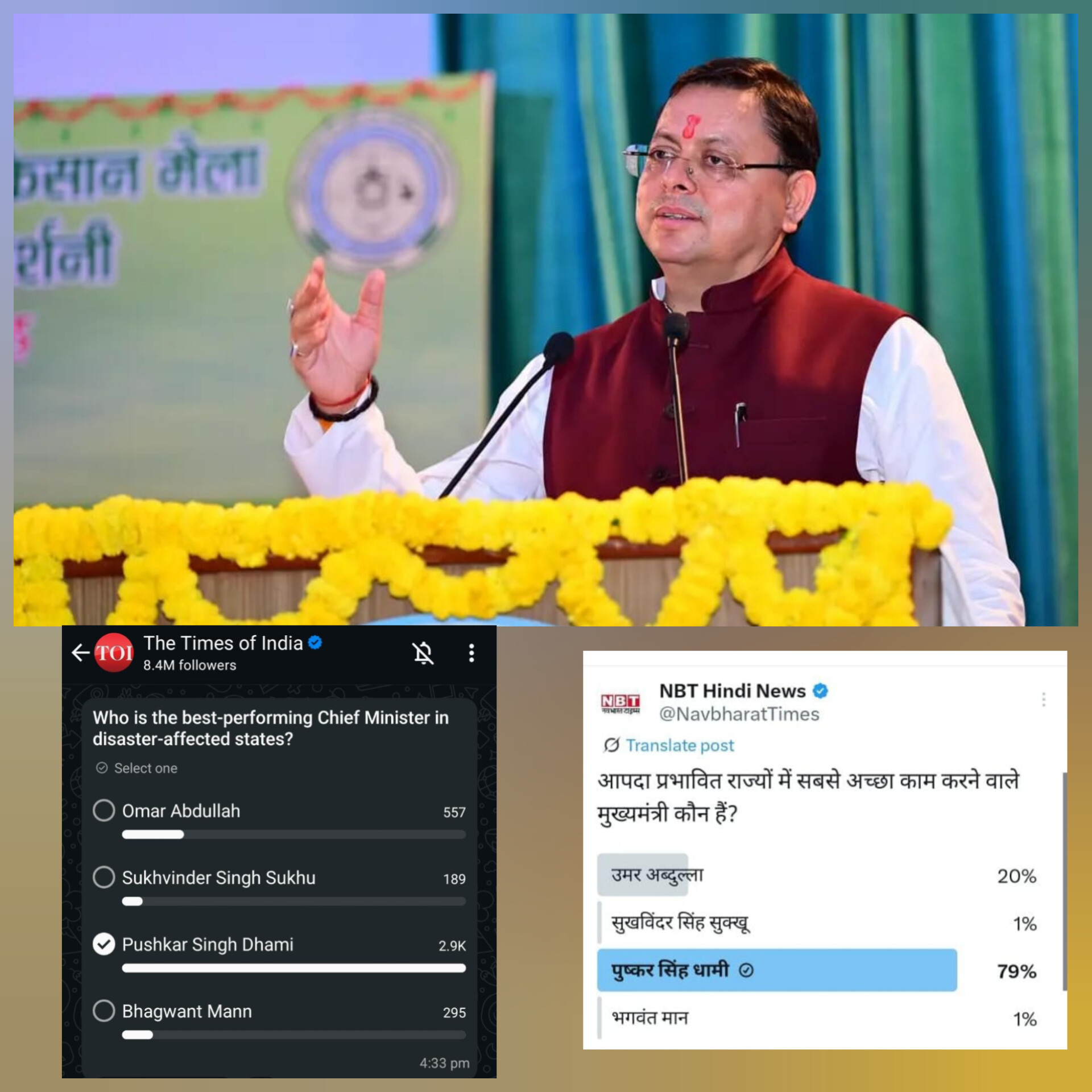 देश के आपदा प्रभावित राज्यों के मुख्यमंत्रियों के कामकाज पर आयोजित टाइम्स ग्रुप के सर्वे में उत्तराखंड के मुख्यमंत्री पुष्कर सिंह धामी ने शीर्ष स्थान हासिल किया है। देश के आपदा प्रभावित राज्यों के मुख्यमंत्रियों के प्रदर्शन को लेकर नवभारत टाइम्स ने हाल ही में एक ऑनलाइन सर्वे कराया। सवाल था “आपदा प्रभावित राज्यों में सबसे बेहतर काम करने वाले मुख्यमंत्री कौन हैं?” इस सर्वे में चार नाम शामिल थे उमर अब्दुल्ला, सुखविंदर सिंह सुक्खू, पुष्कर सिंह धामी और भगवंत मान।